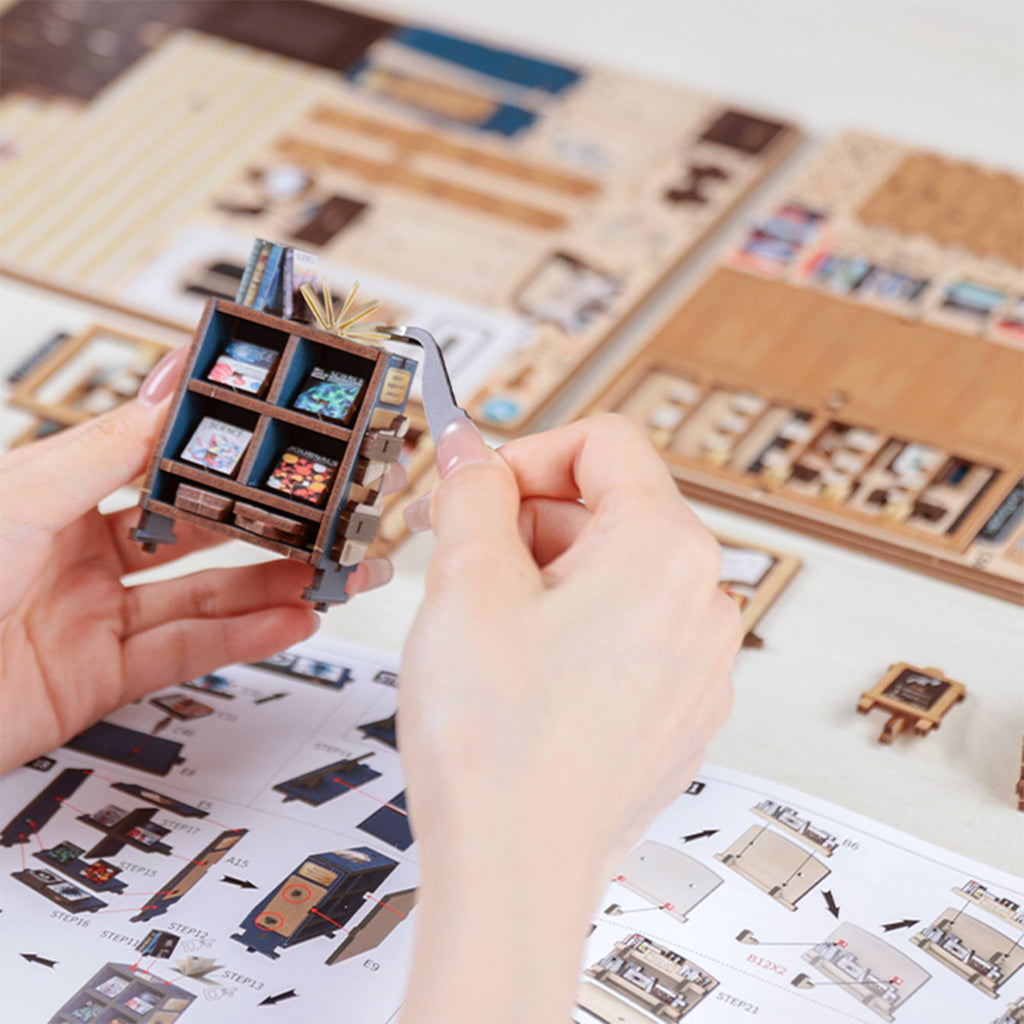 This beautifully detailed miniature recreates the inviting warmth of a cozy corner bookshop-complete with shelves brimming with books, a welcoming open door, and a soft, golden glow from the LED lights that illuminate the scene. From the intricate woodwork of the storefront to the tiny posters, plants, and meticulously arranged reading materials inside, every piece invites you to slow down, take your time, and craft a scene that feels like a sanctuary for the soul. Whether you place it on your bookshelf or gift it to a fellow book lover, this book nook transforms any space into a story waiting to be told. 2 AAA batteries required; batteries are not included. Age Range: 14+ Assembled Dimensions: 4.9 x 4.1 x 6.7 inches Assembly Time: 2 hours Piece Count: 168