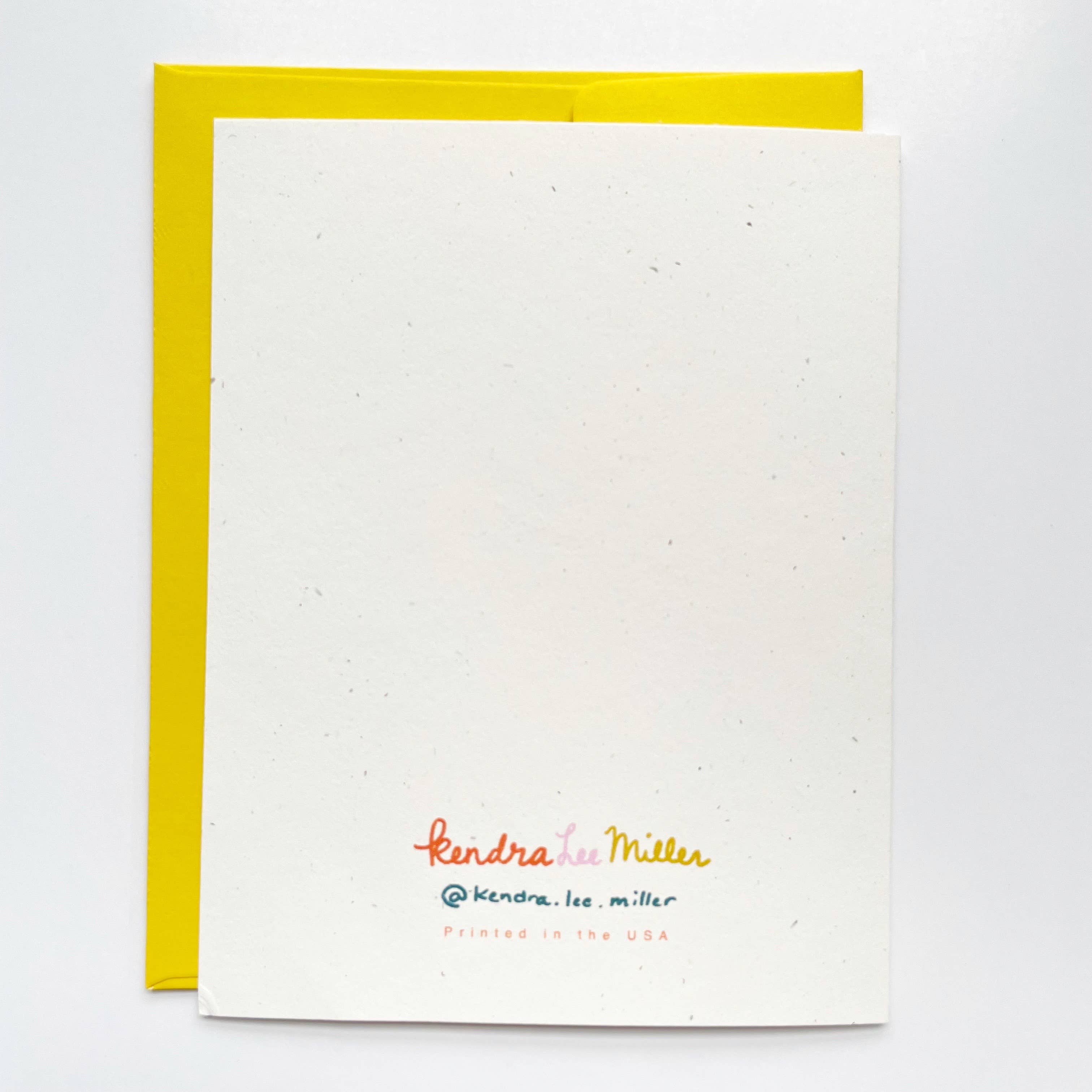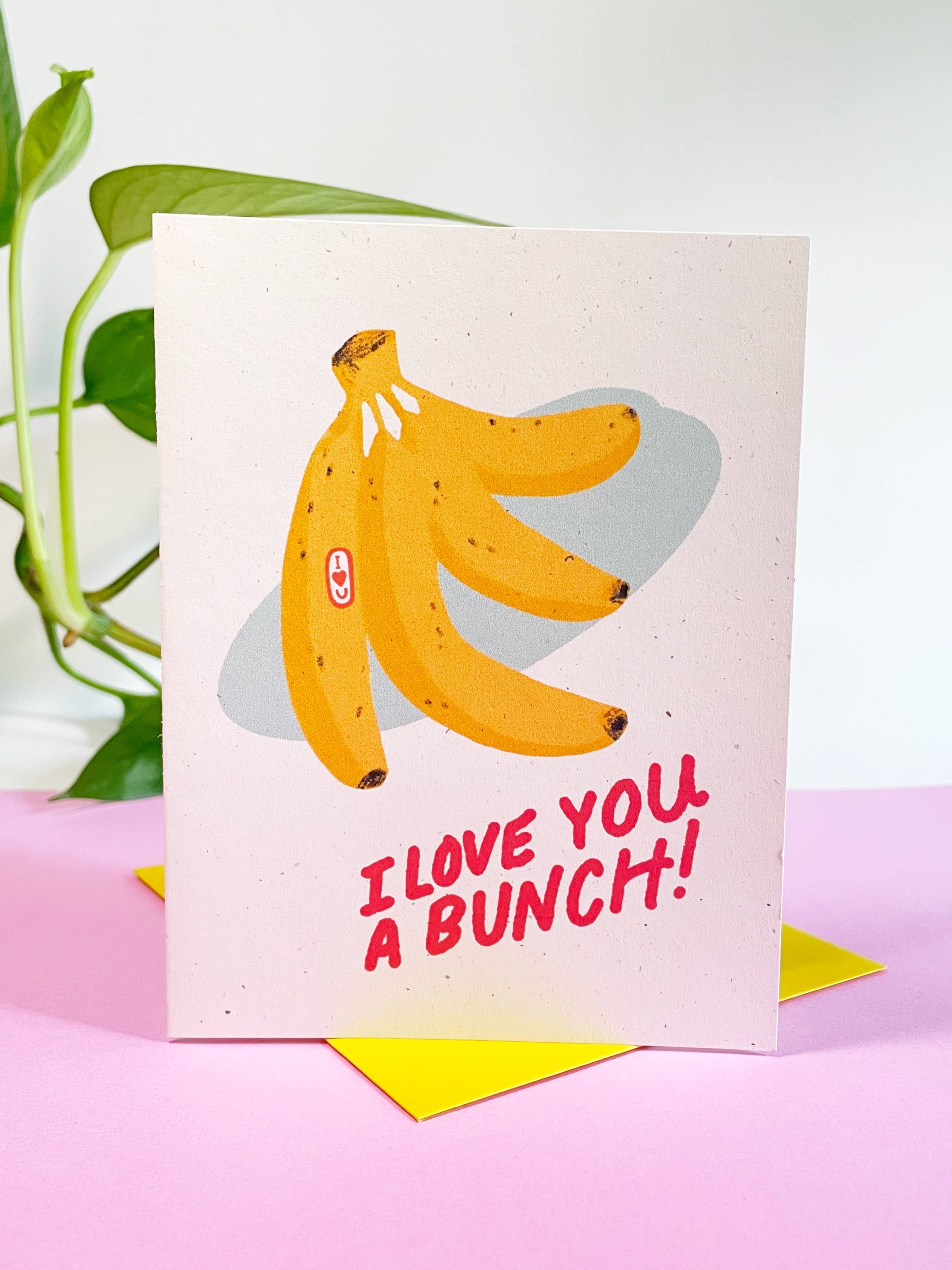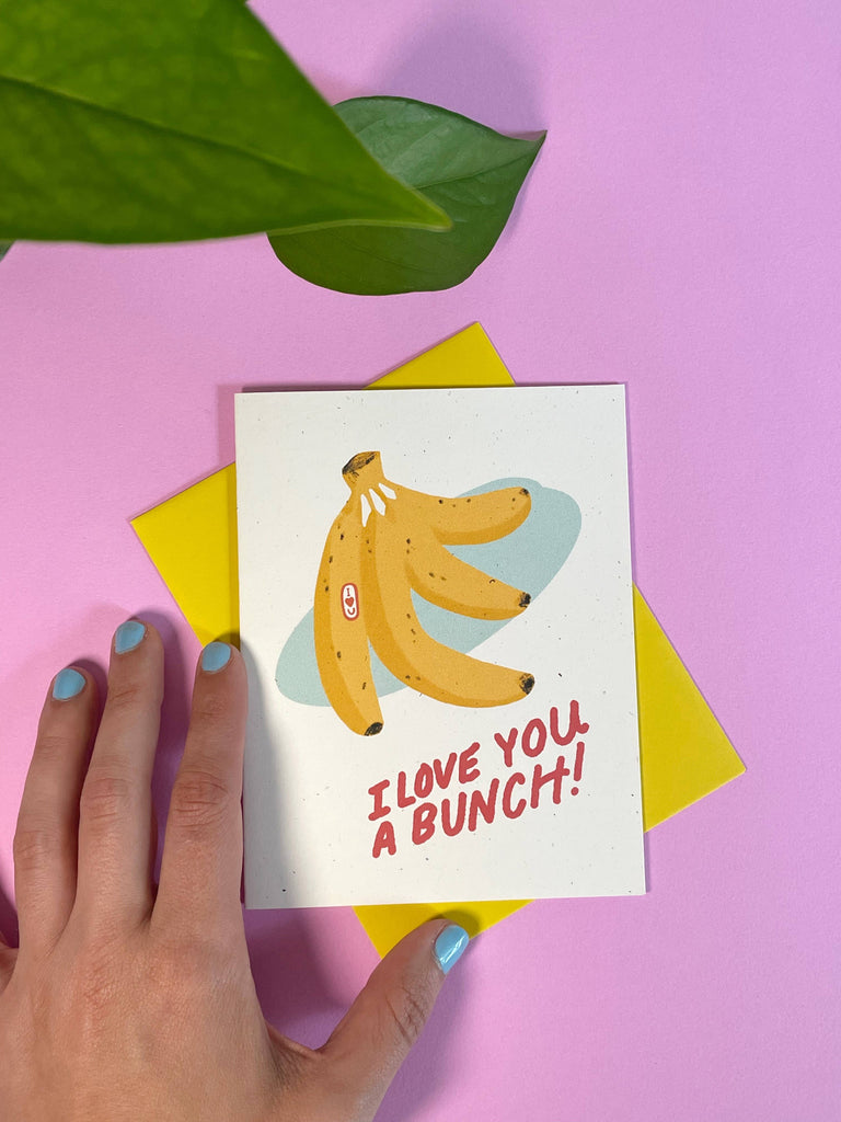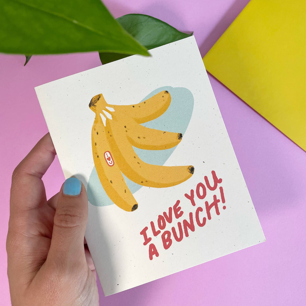 Punny cards are my jam! This card features an illustrated bunch of bananas with a sticker on the banana that says “I ❤️ U”. Underneath the bananas written out like a grocery store window style- “I love you a bunch!”