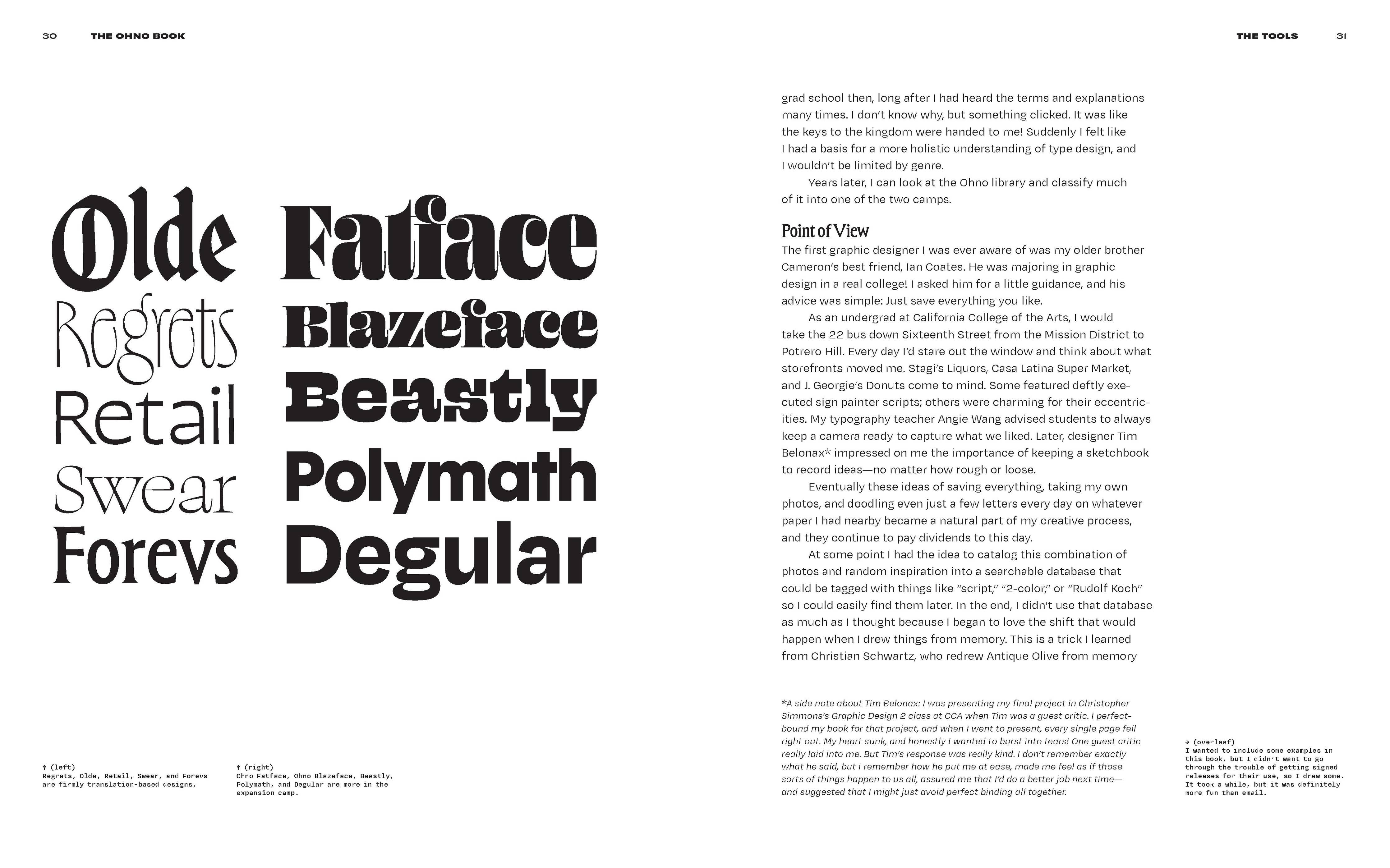 OH no Type Co.'s wildly imaginative fonts—including Beastly, Casserole, Hobeaux, Ohno Fatface, Polymath, Regrets, and Vulf—lend an exuberant, psychedelic flair to packaging, editorial design, gig posters, and apparel, earning the company cult-like status in the graphic design community.