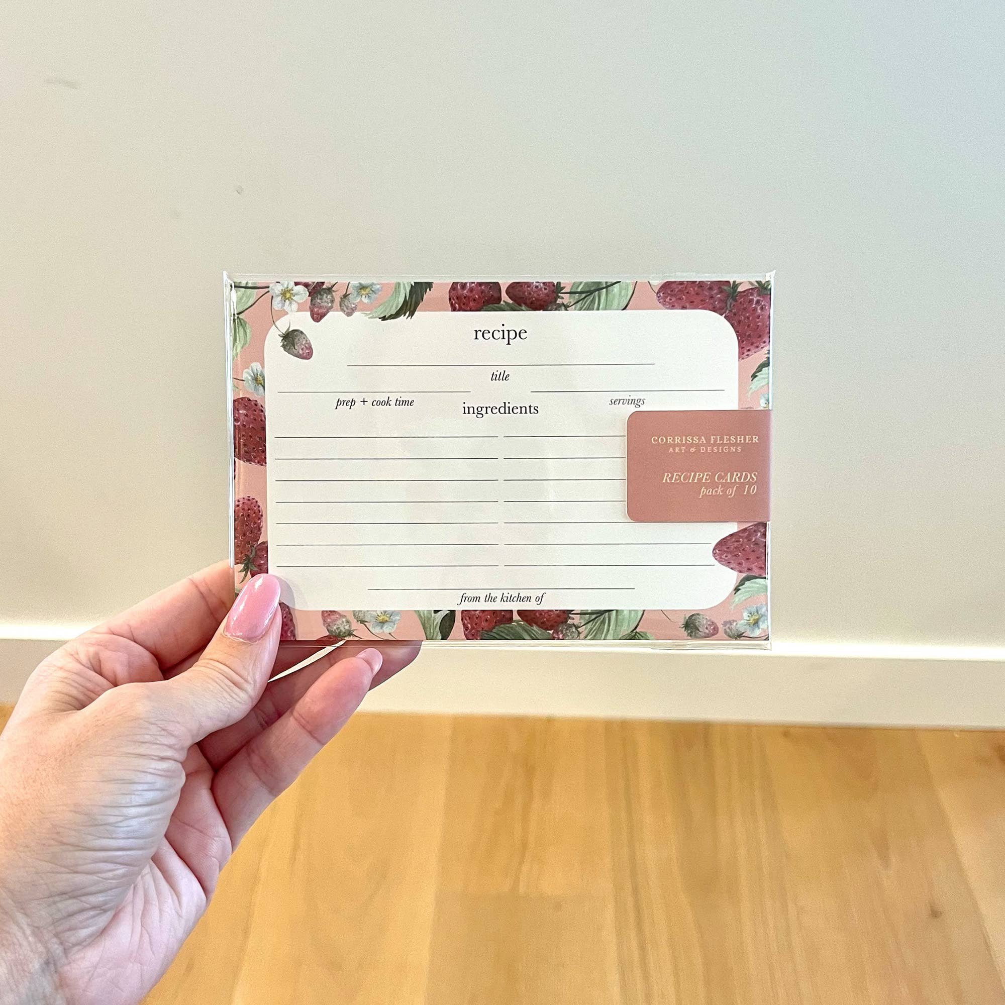 A set of 10 recipe cards featuring hand-painted strawberries with a blush pink background. Perfect for sharing family recipes, bridal showers, or adding a warm vintage-style touch to any kitchen.