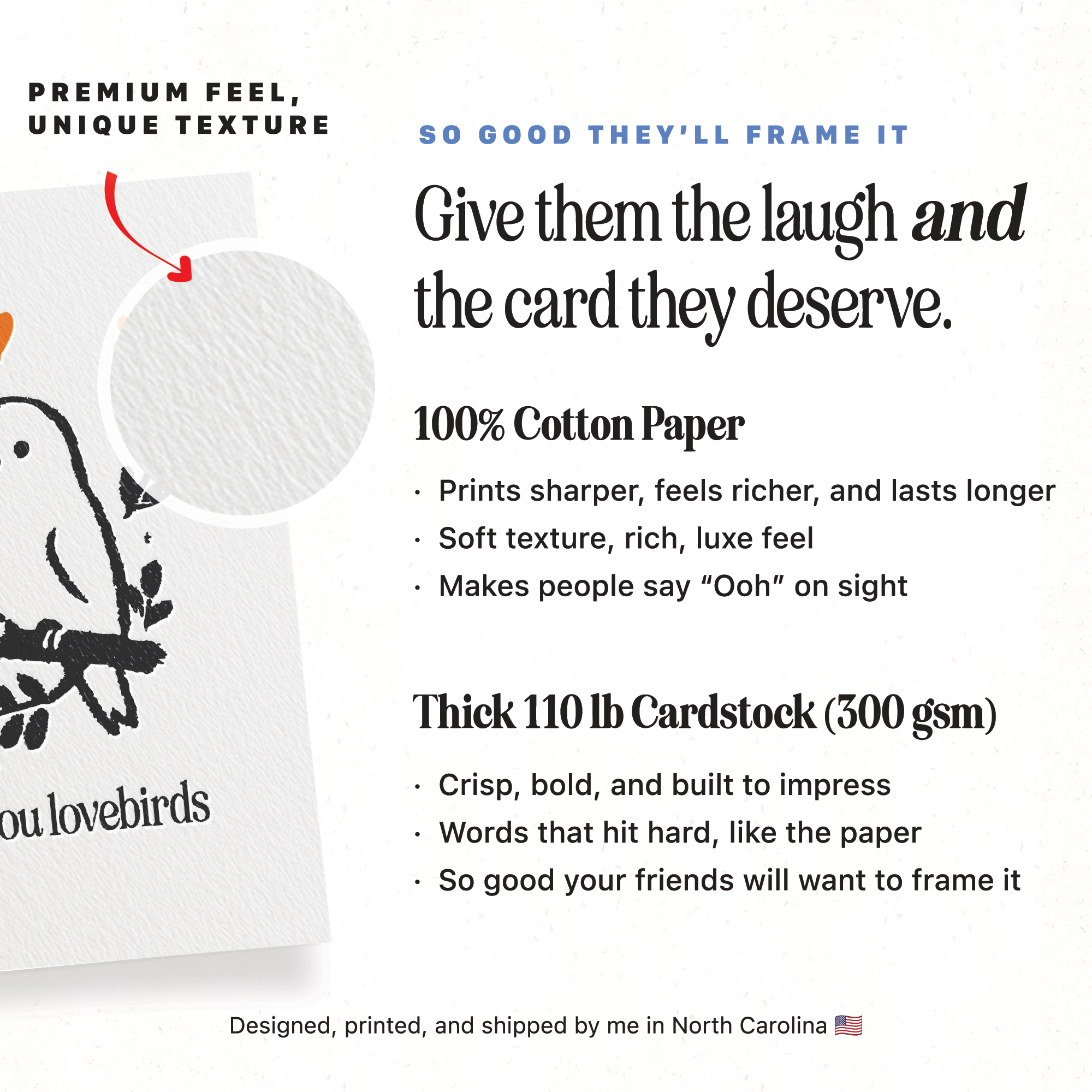 If you know a pair of lovebirds who just got hitched or engaged, this is the snarky little nod they deserve. Cute, yes. Sincere? Sure. Mushy? Kinda.