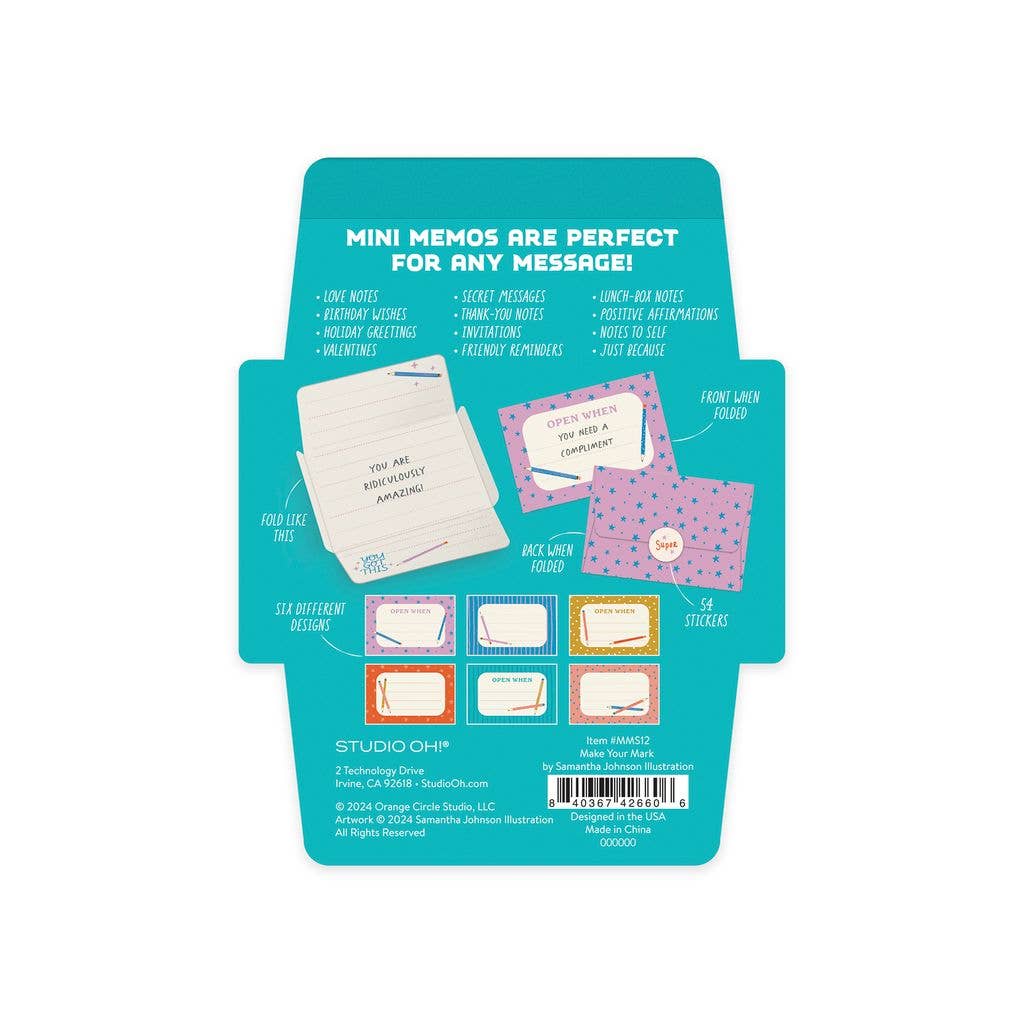 Use these Mini Memos to send perfectly timed messages to family, friends, frenemies, lovers, or anyone else! Hype someone up, celebrate milestones, say you're sorry, spill some tea, or send good vibes when they're needed most. The memos come in pads of 48 tear-off sheets, and each one can be folded into a tiny envelope and sealed with a matching sticker. Every sheet features cheerful designs or "open when..." prompts for birthday wishes, love notes, support, or humor at just the right moment.
