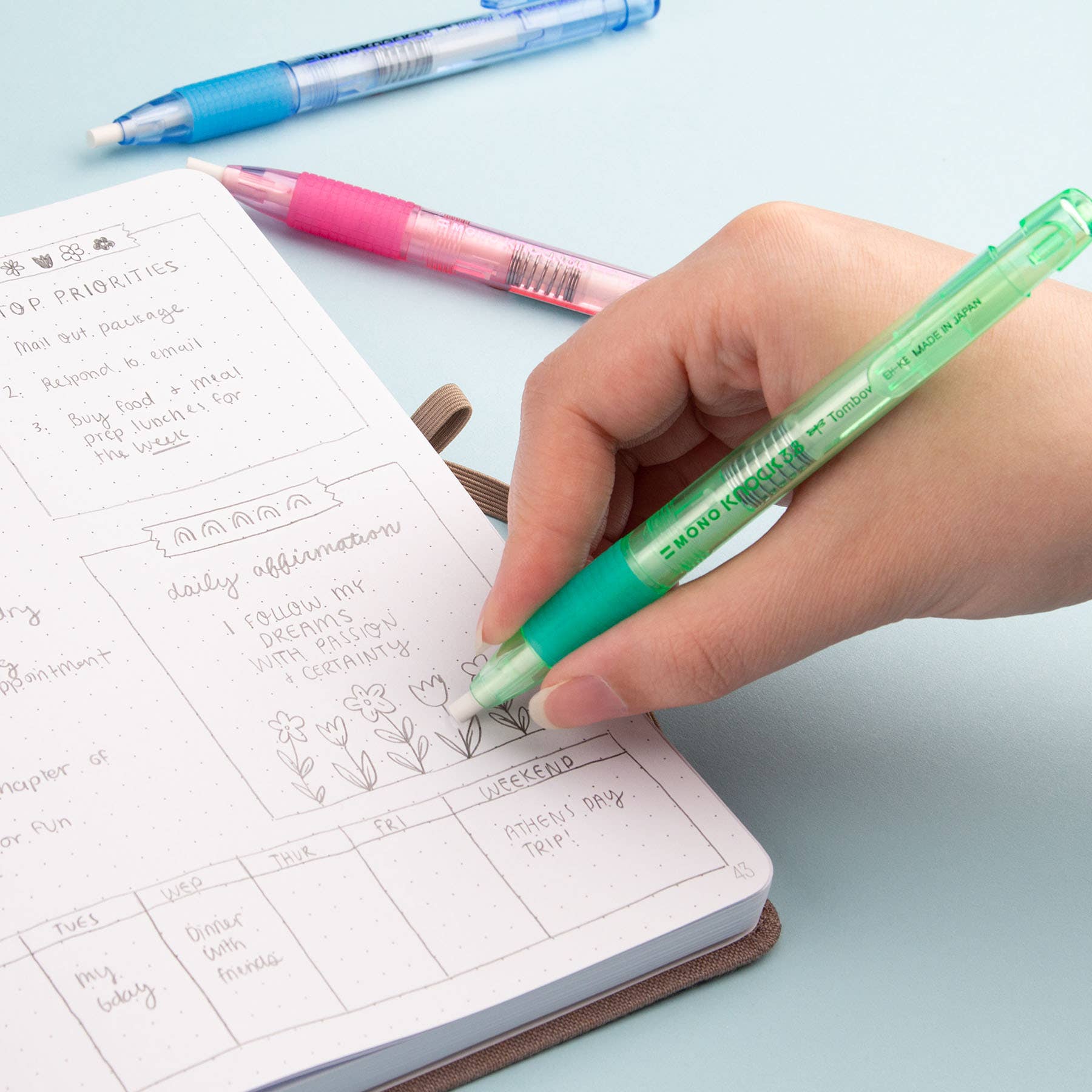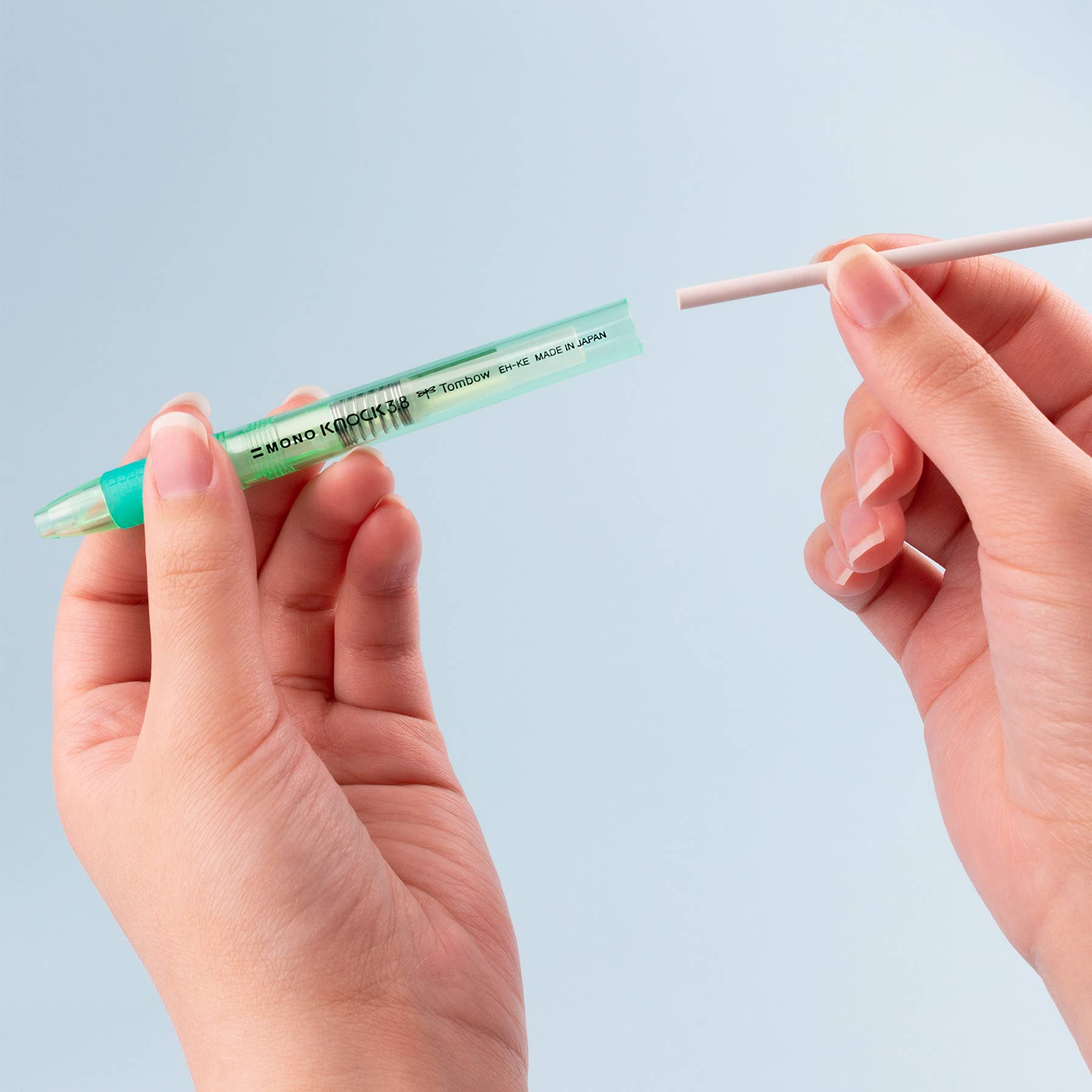 The MONO Knock eraser has a pen-style body that is easy to use and store. Convenient clip for on-the-go corrections. Features a rubber grip for comfortable use. Round; 3.8mm diameter. Available in Pink, Green, and Blue.